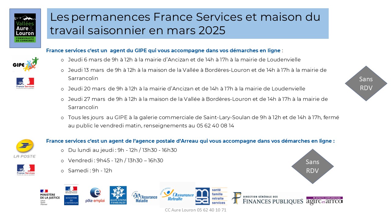 Les permanences en Mars 2025 : DDFIP, Renov'Occitanie, OPAH, France Services, Maison du travail saisonnier, CIDDF, Mission Locale, Accompagnement social