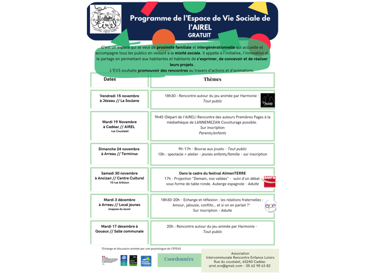 Espace de vie sociale AIREL : programme Novembre-Décembre 2024